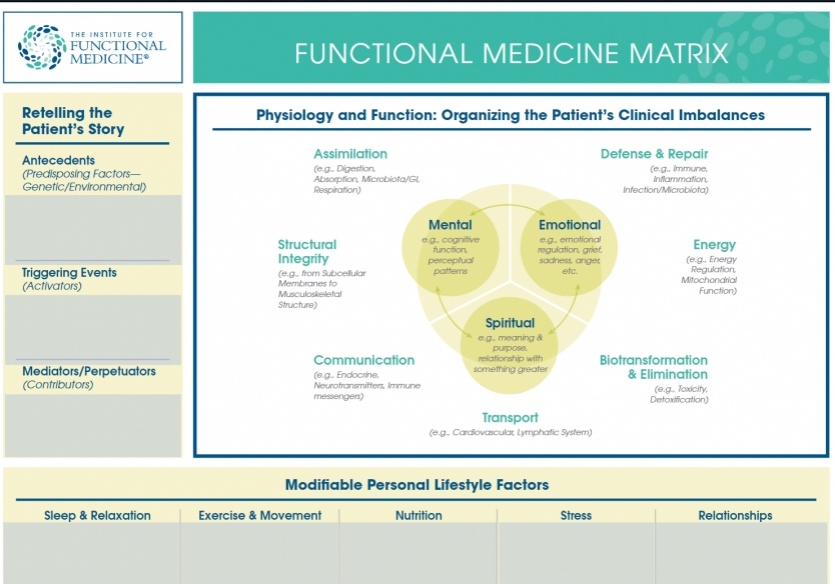 La médecine fonctionnelle reconnaît que la maladie n'est pas isolée et les outils de la boîte à outils de l'OIF, comme la matrice, aident les cliniciens à examiner les systèmes corporels, les symptômes et les facteurs de risque associés à l'état de santé de leurs patients. Plus précisément, la matrice permet au clinicien d'organiser les déséquilibres cliniques d'un patient dans les systèmes biologiques suivants, appelés "nœuds".