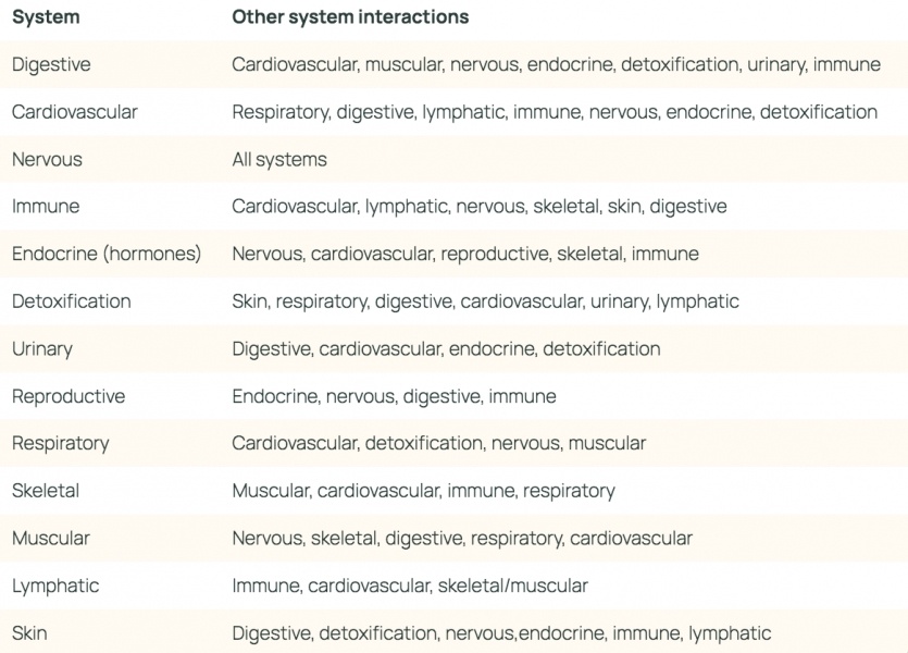 À chacun des dix systèmes peuvent être associés des symptômes, des antécédents personnels (médicaux, psychologiques), des antécédents familiaux, des médicaments, etc., selon que le système est affecté ou causal. L'art consiste à mettre en évidence les interdépendances entre les différents systèmes, mais aussi à définir les systèmes perturbés qui dominent l'histoire naturelle de la maladie/des maux.